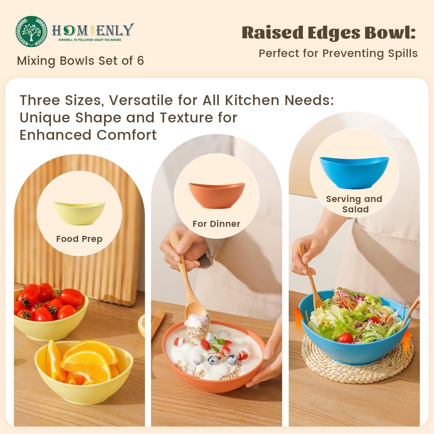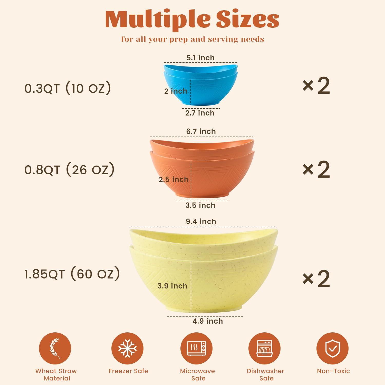 COMES IN THREE SIZES: Our mixing bowls set of 6 includes 10oz small bowls, 26oz cereal bowls, and 60oz large salad bowls, with two of each size. The variety of sizes meets your daily needs: the 10oz small bowls are perfect for snacks, nuts, ice cream, candy, or prepping ingredients. The 26oz bowls are ideal for cereal or dinner. The 60oz large bowls are great for salads, vegetables, serving, and popcorn.