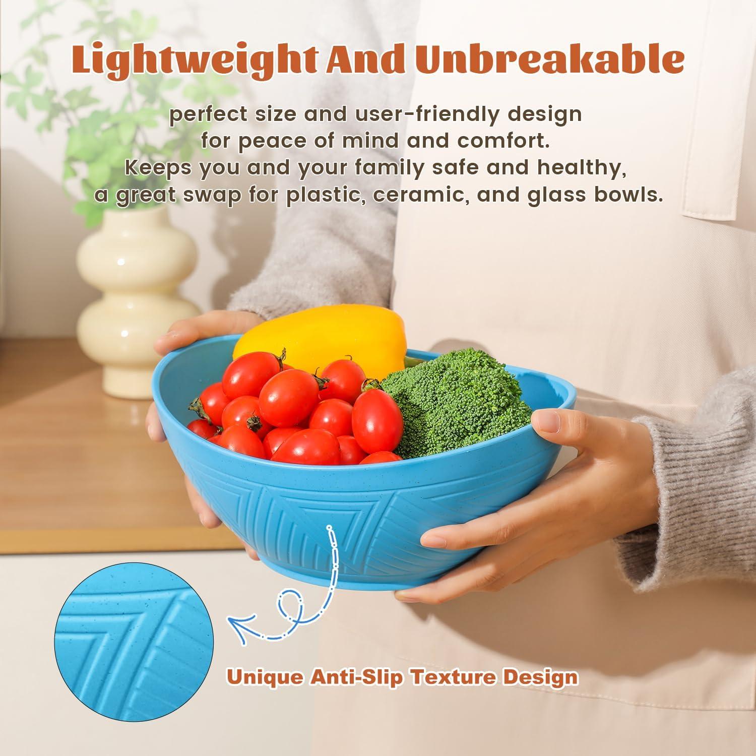 UNIQUE TEXTURE DESIGN: Not just for decoration, these textures also serve as anti-slip features. Geometric texture designs combined with vibrant colors make each bowl unique. These wheat straw mixing bowls not only add variety to your dining table but also ensure the safety of you and your family.