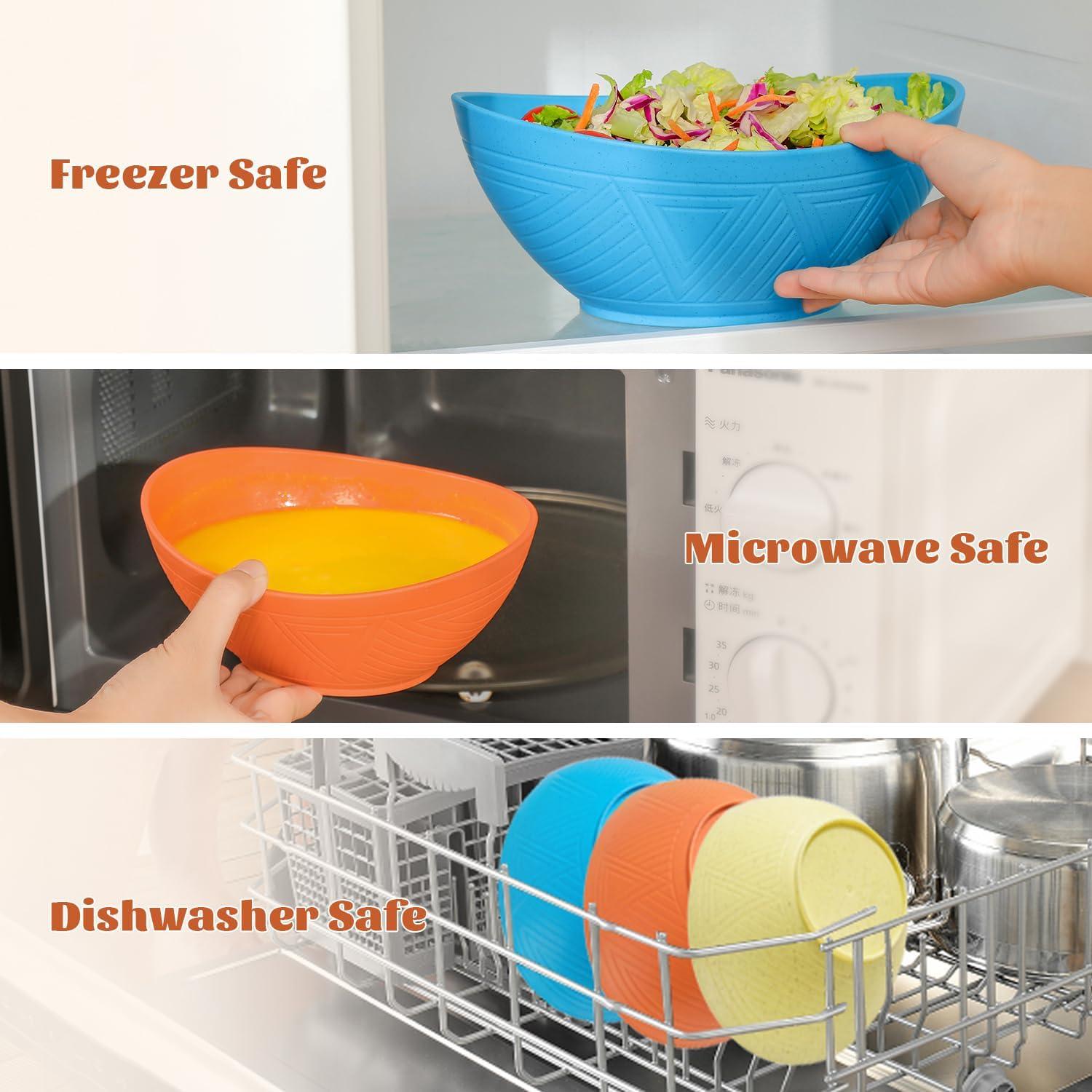 DISHWASHER, FREEZER AND MICROWAVE SAFE: It's not same as plastic mixng bowls,these microwave and dishwasher safe bowls are very easy to clean, you can wash them into your dishwasher. And they work great in microwaves without getting too hot.[ Note: The temperature resistance reaches up to 248 degrees Fahrenheit (120℃).]